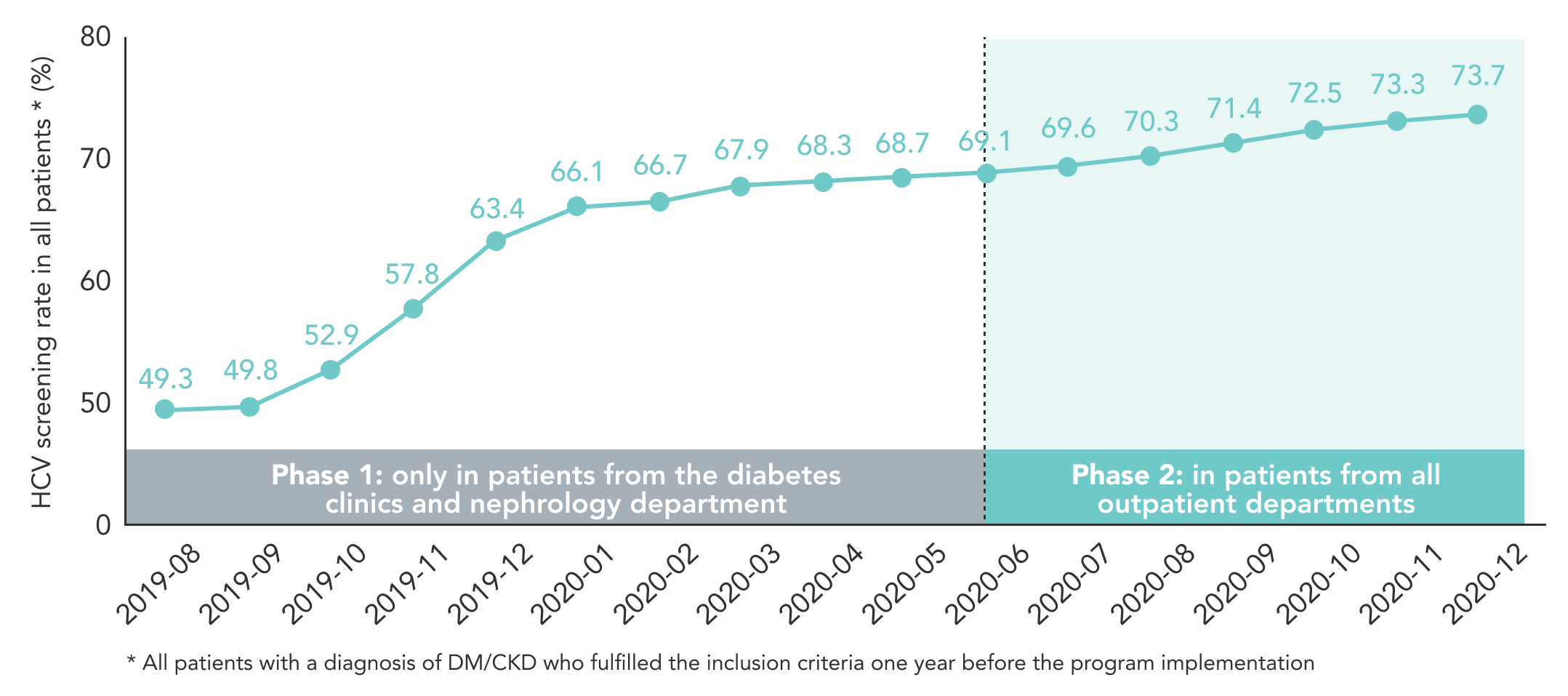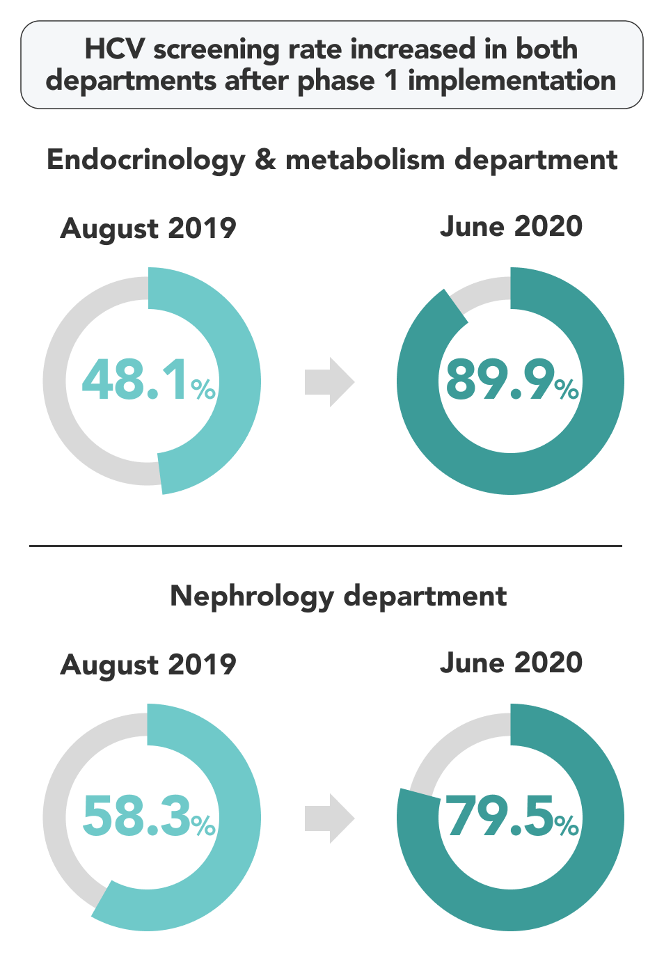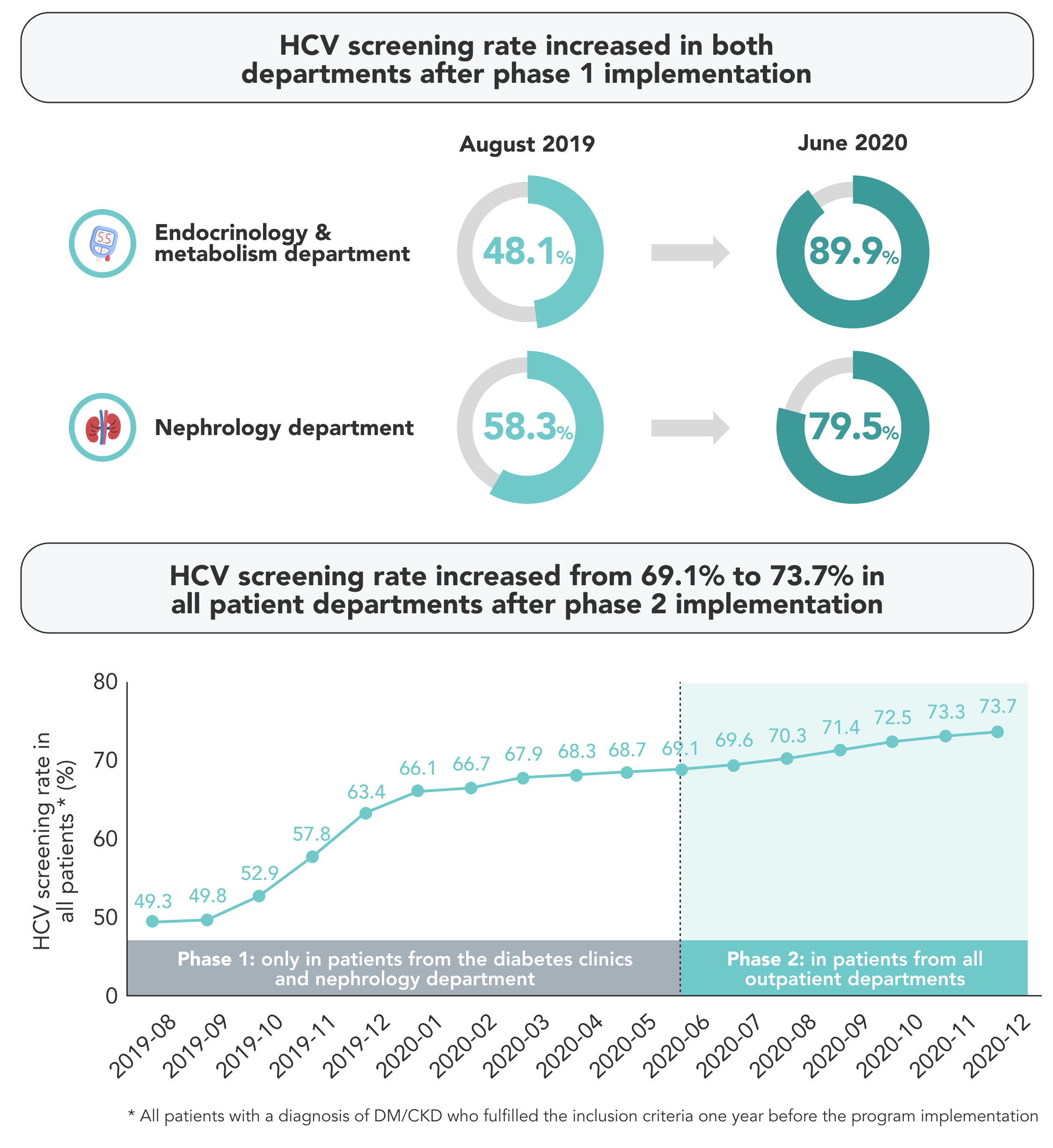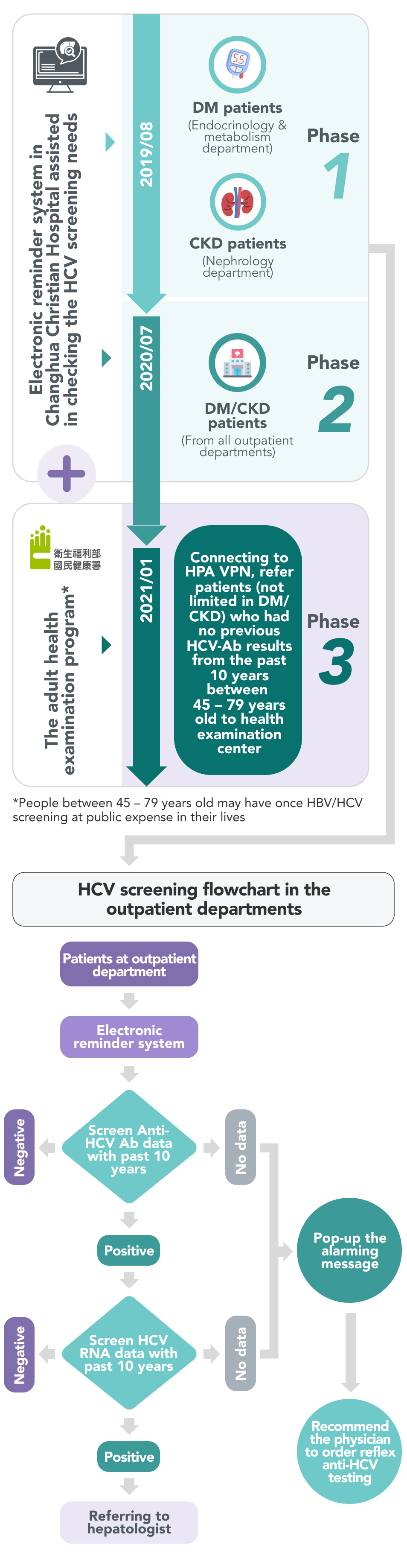 Using an electronic reminder system in DM/CKD patients can improve the HCV screening rate in either phase 1 or phase 2 and can achieve the highest screening rate after 3 months of the implementation. Changhua Christian Hospital is the first hospital utilizing an electronic alert system combined with the adult health examination data from HPA to achieve a higher HCV screening rate. We are looking forward to this collaborative care strategy that can serve as a model for micro-elimination of HCV in hospital-based settings.