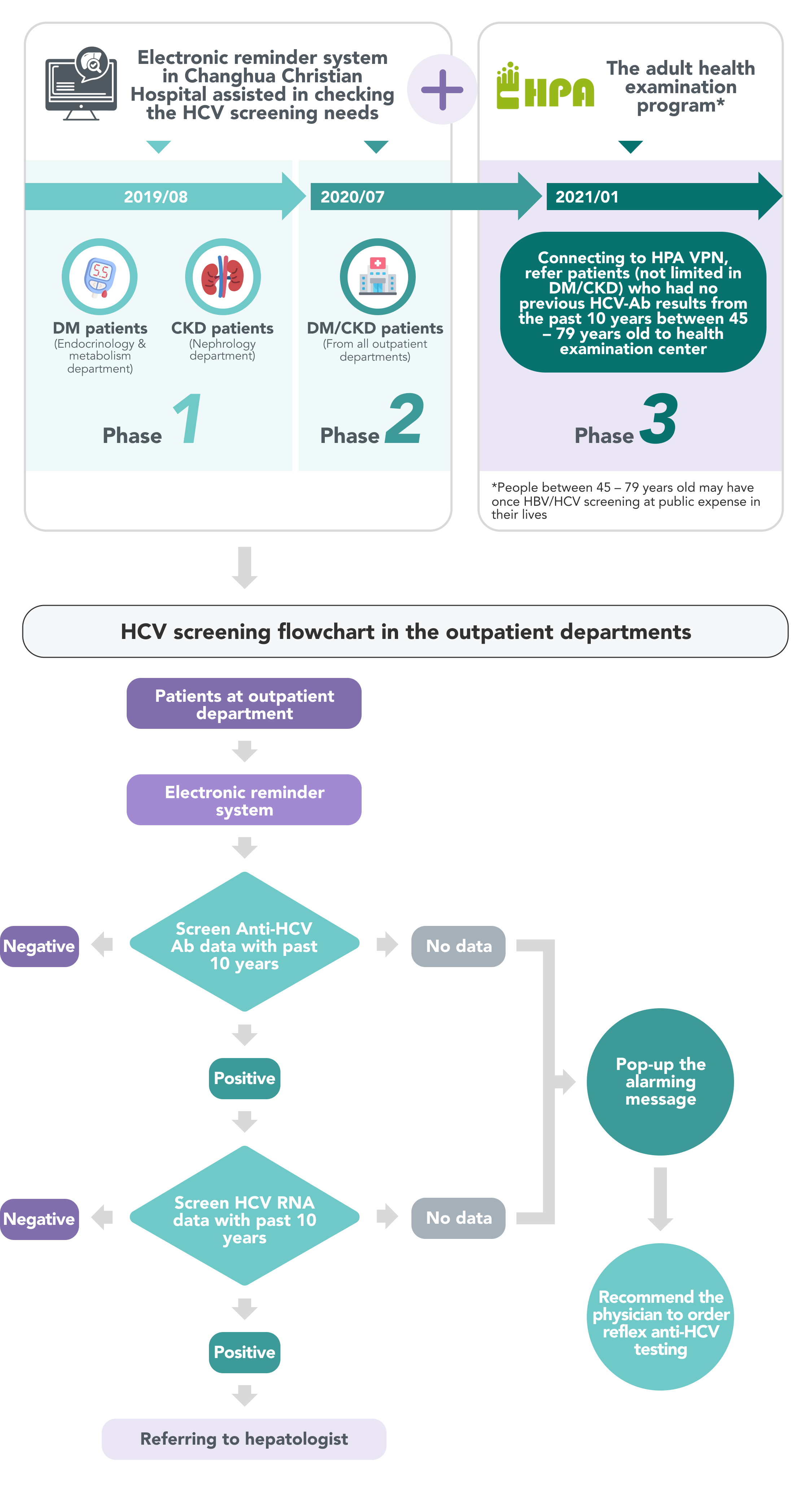 In response to the government policy for HCV elimination, Changhua Christian Hospital designed and assessed an electronic reminder system for HCV screening in patients with a diagnosis of DM from the diabetes clinics or CKD from the nephrology department from August 2019, and extended to DM/CKD patients from all outpatient departments in the hospital from July 2020. The electronic reminder system would automatically check the HCV-Ab status and recommended physicians to order reflex anti-HCV test (including HCV-Ab and HCV RNA testing) in patients who had no previous HCV-Ab results from the past 10 years. Moreover, in order to improve the HCV diagnostic rate, the electronic reminder system began connecting to the adult health examination data from HPA from January 2021 to refer eligible patients to have reflex anti-HCV test.