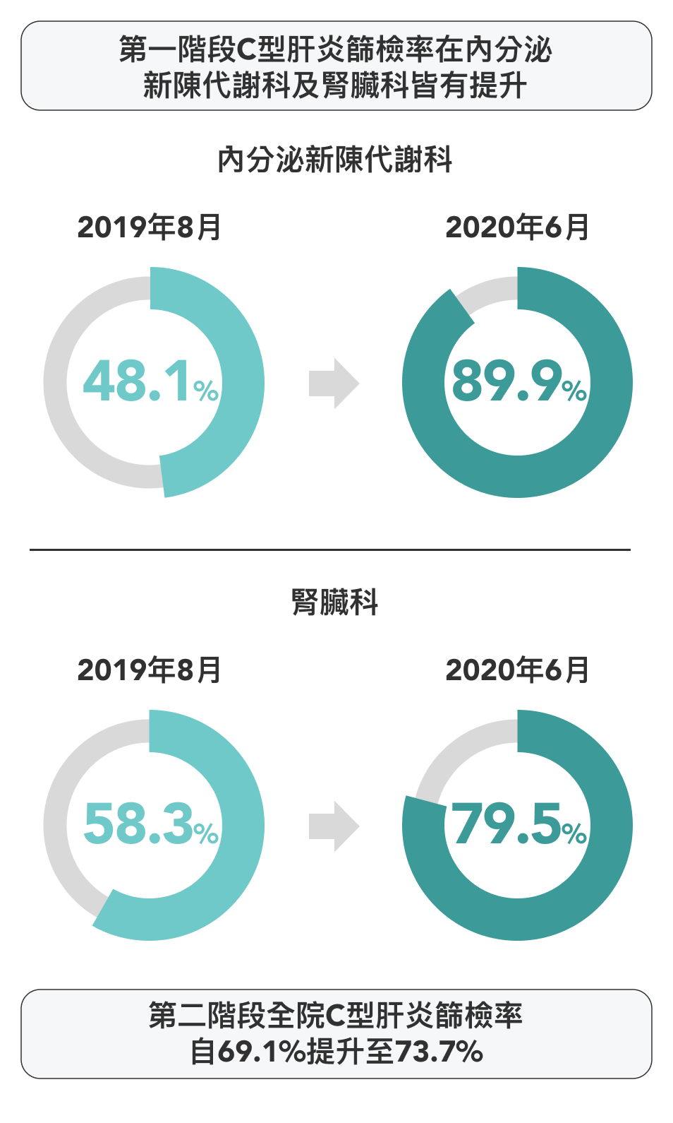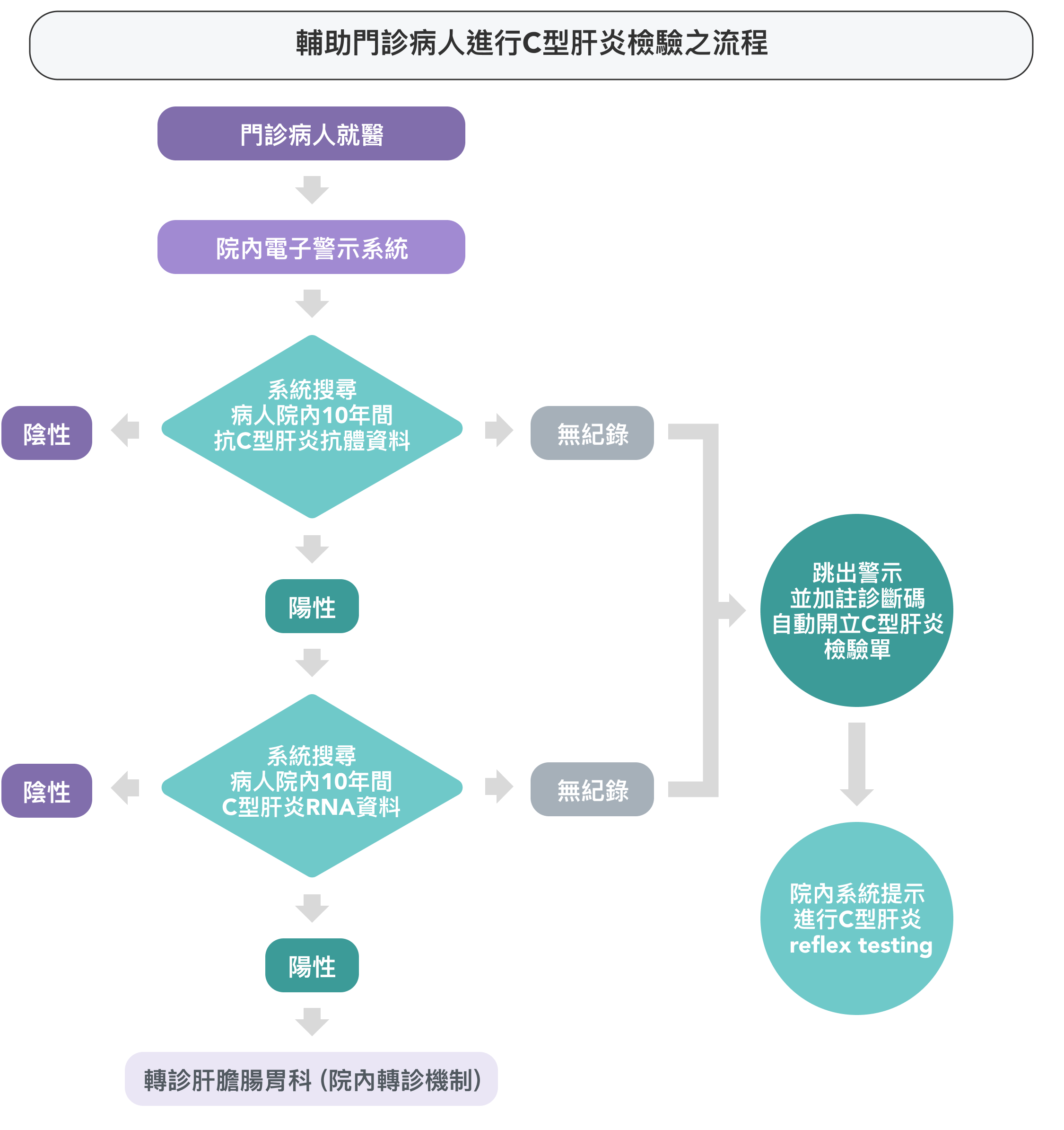 為積極響應彰化縣衛生局的C型肝炎消除計畫,彰化基督教醫院(以下簡稱彰基)率先成立了「C型肝炎消除推動委員會」,集結院內多個科別與相關行政單位共同參與,以推動電子警示系統為最主要的重點項目。自2019年8月起先由C型肝炎感染盛行率較高,來自內分泌新陳代謝科的糖尿病 (DM) 和腎臟科的慢性腎臟病 (CKD) 病人族群,找出院內10年間未做過C型肝炎篩檢者,自動開立抗C型肝炎抗體與C型肝炎RNA檢驗單,2020年7月起擴展至全院不分科別DM/CKD病人,並於2021年1月開始結合國健署成人健檢之B、C型肝炎檢驗轉介,提升C型肝炎病人獲得診斷的機會。